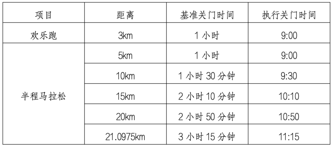 为了保证参赛选手比赛安全,限时对社会交通进行滚动封闭。比赛路线各段专设了赛事关门时间,关门时间之后,相应公里点的计时毯停止工作,相应路段将恢复社会交通。在规定关门时间内,未跑完对应距离的参赛选手须立即停止比赛,退出赛道,以免发生危险。退出比赛的选手可到沿途收容站搭乘收容车或自行选乘公共交通到达终点取衣区。关门时间按自然时间计算,具体见下表:关门距离和时间(8:00起跑):